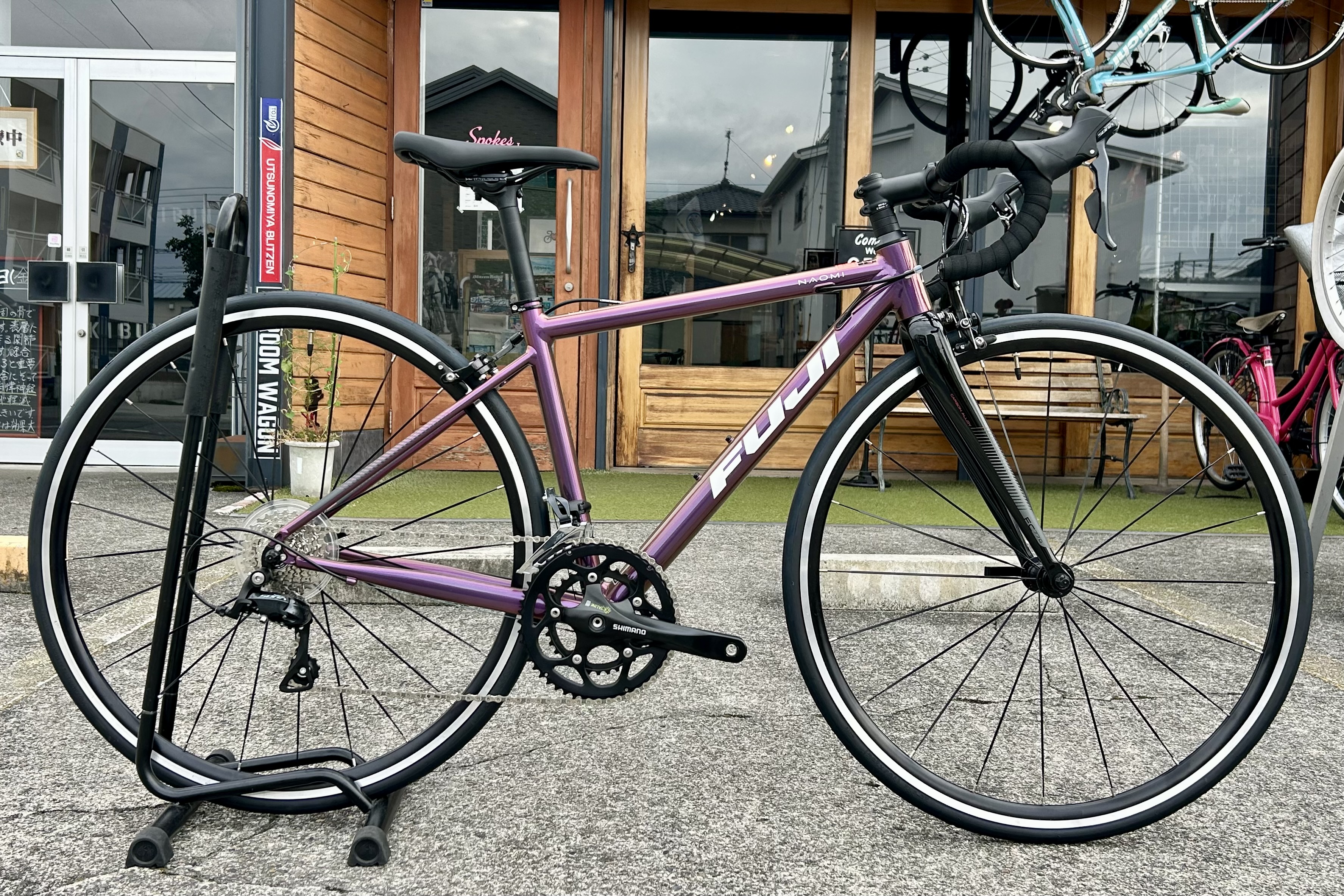 はじめてのロードバイクにおすすめの、キャリパーブレーキ仕様のアルミロード。2×9段変速。こちらは、日陰と日向等の光の当たり具合でもニュアンスが変化するvelvet opalカラーです。